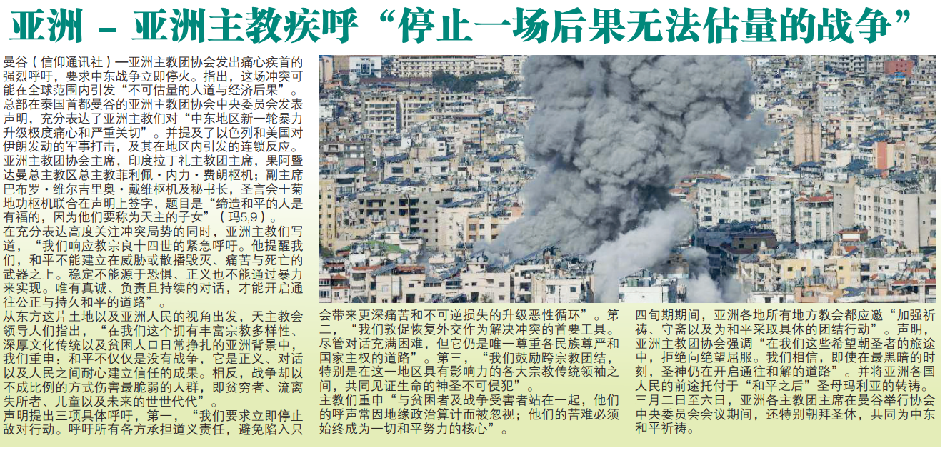 亚洲 – 亚洲主教疾呼 “停止一场后果无法估量的战争”