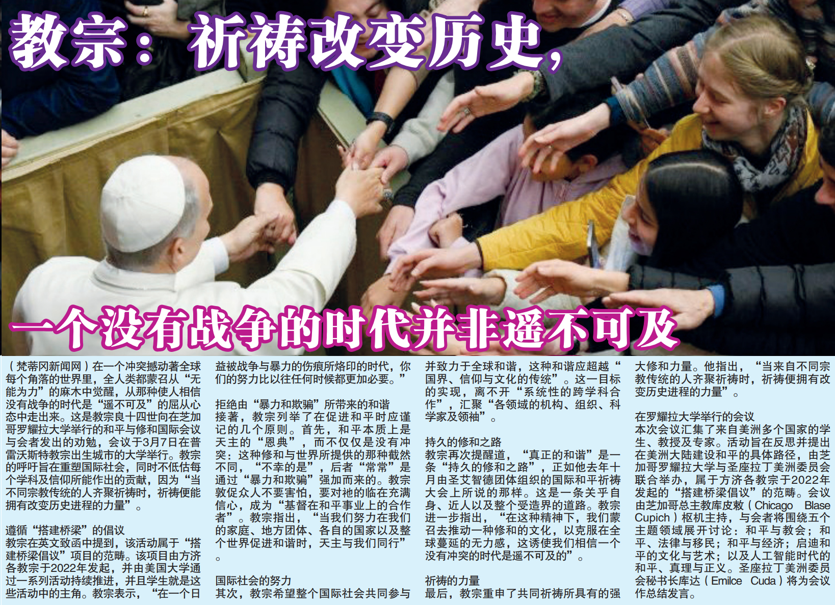 教宗:祈祷改变历史,一个没有战争的时代并非遥不可及